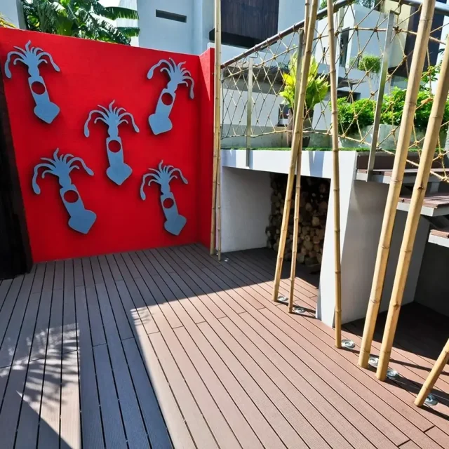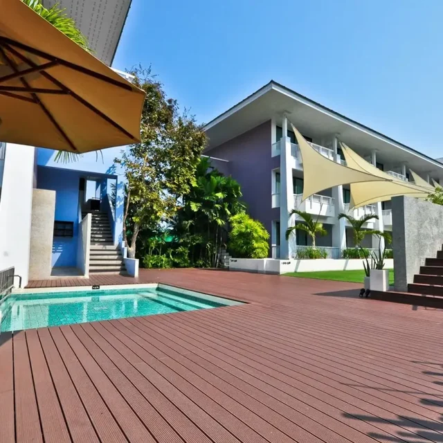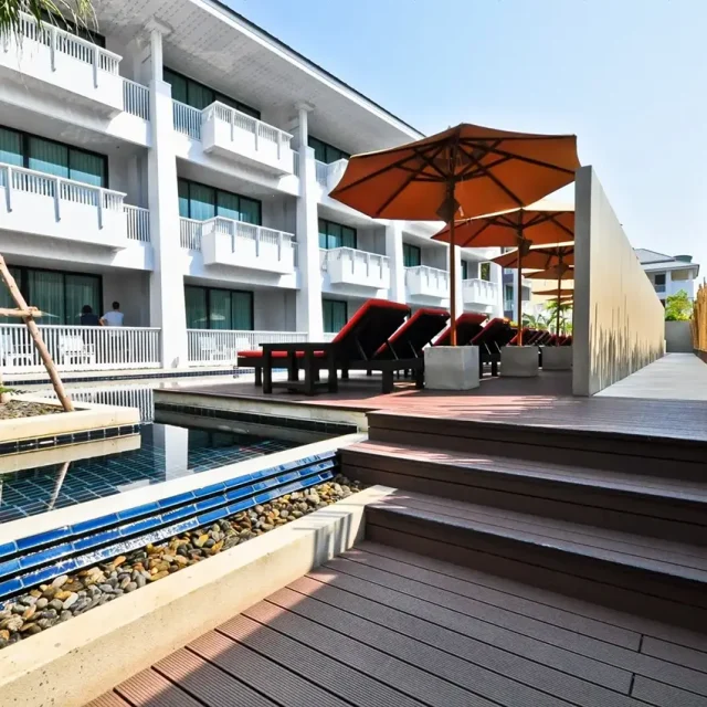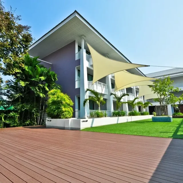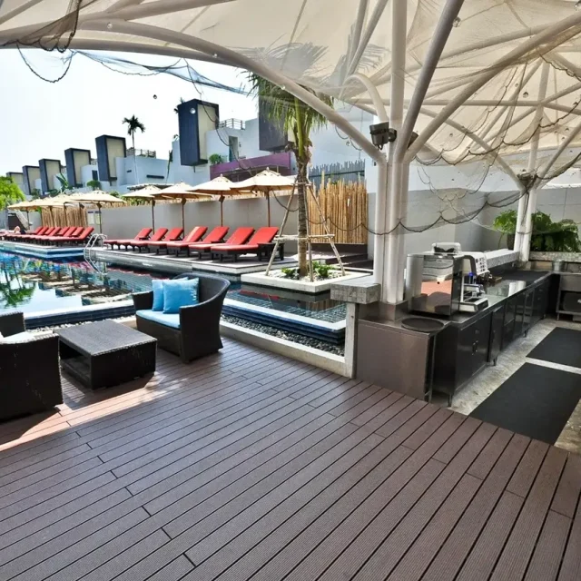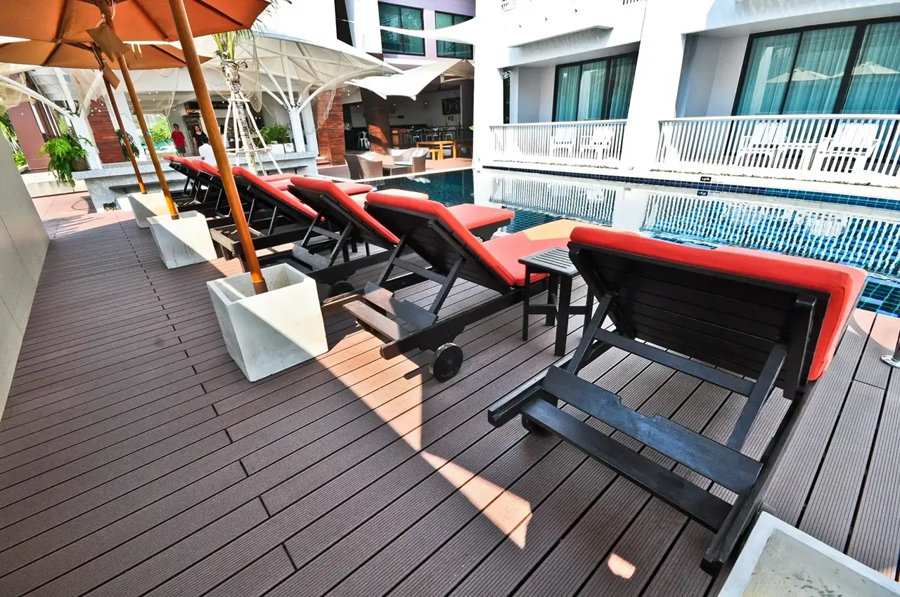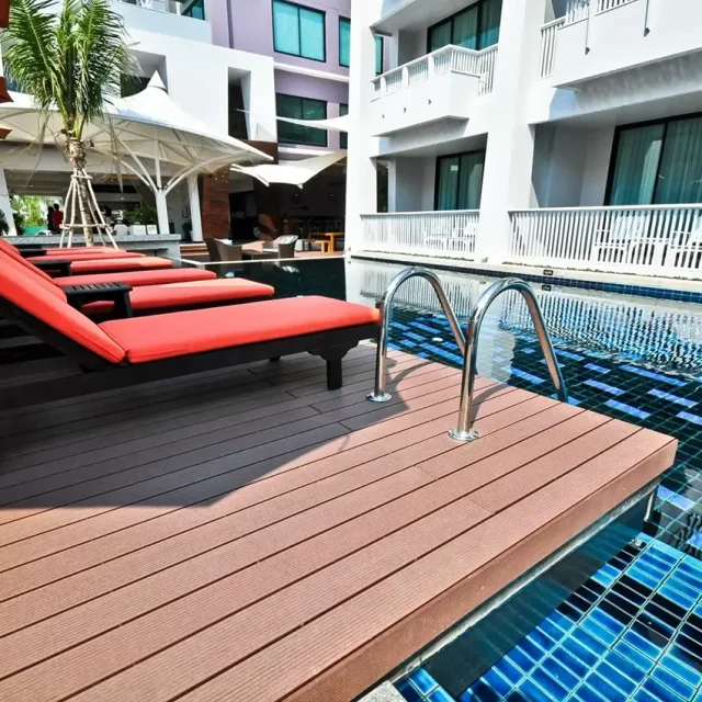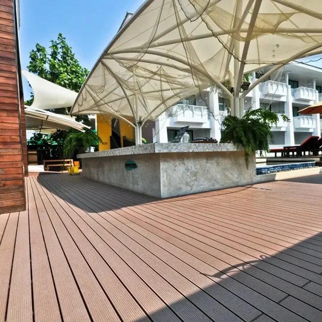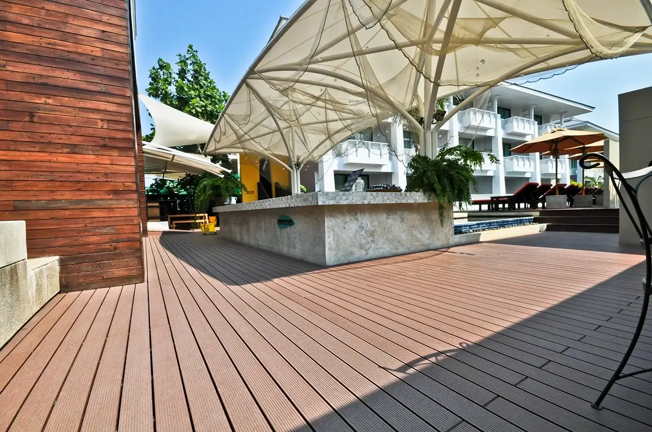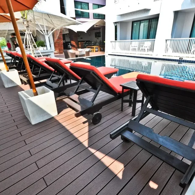 HYBRID WOOD ติดตั้งด้วยไม้พื้น หน้ากว้าง 4 นิ้ว มีความแข็งแรง ทนทานต่อแสง UV ความซีดจางจะช้ากว่าไม้จริงเป็นระยะเวลาหลายปี ทำให้ผู้เข้าพักได้รับความสดใสจากสีสันการตกแต่งของรีสอร์ทอย่างเต็มที่