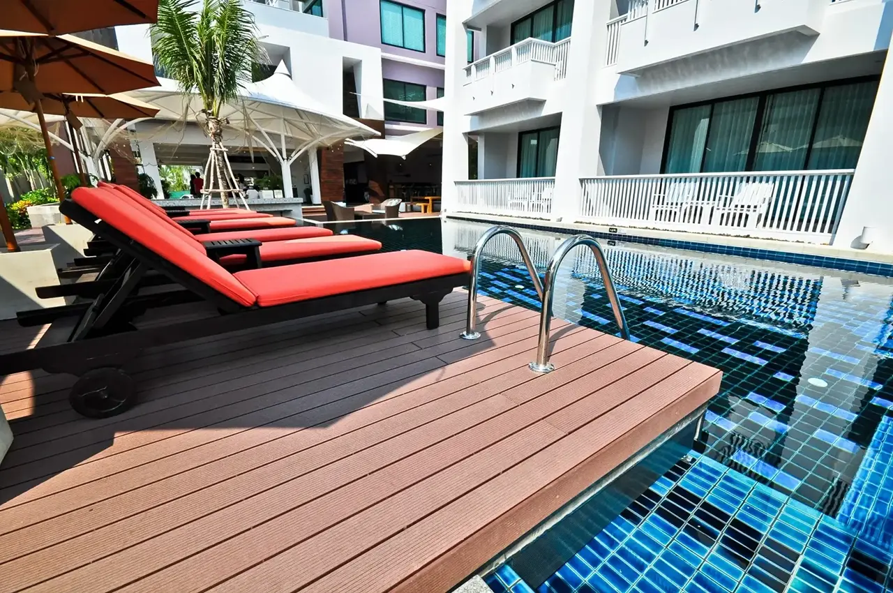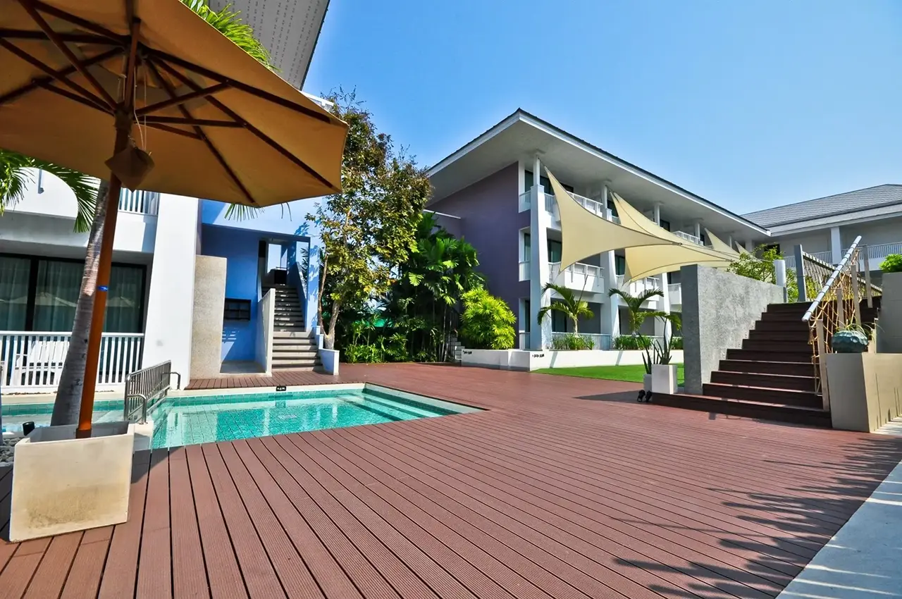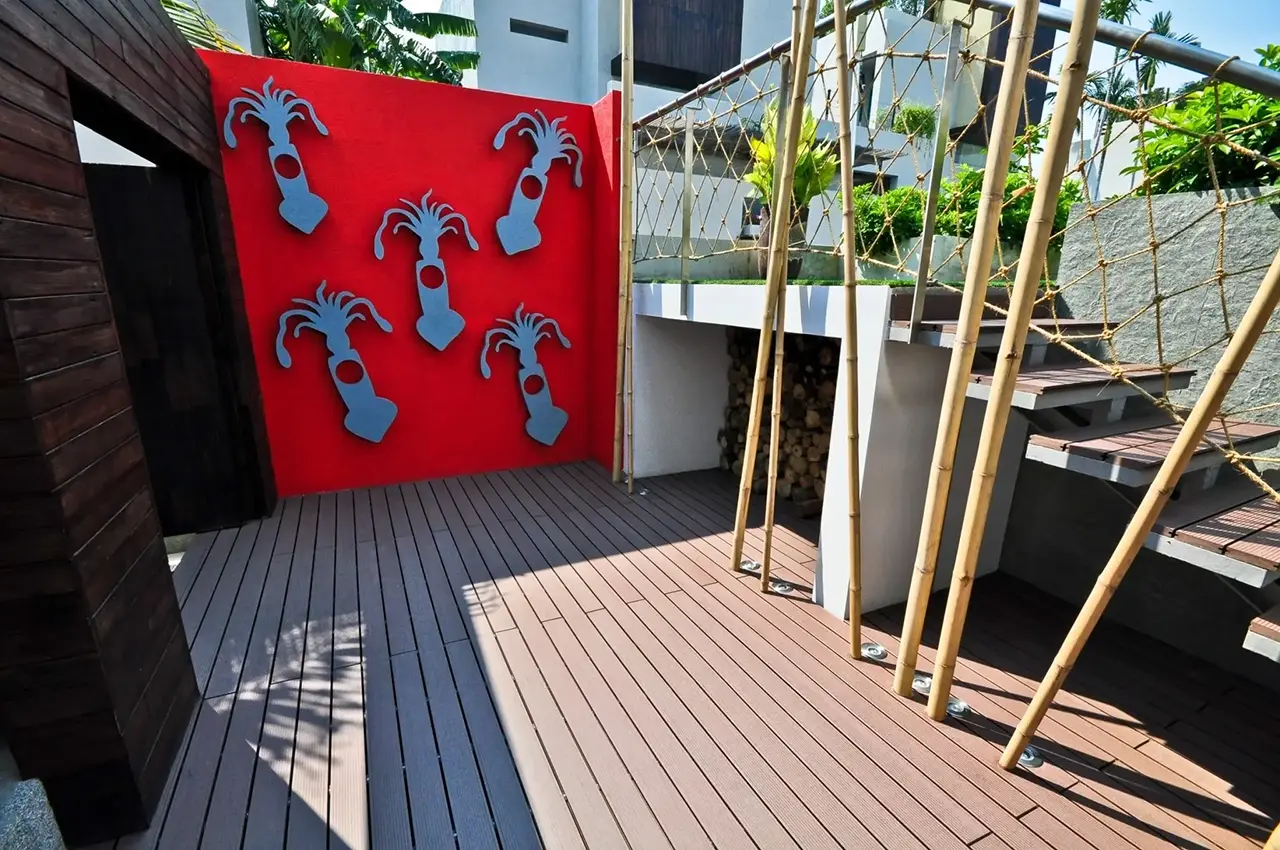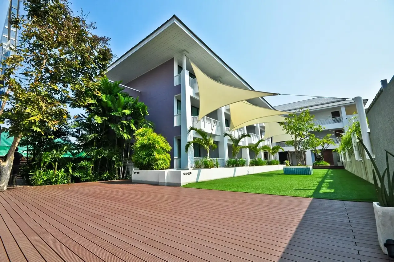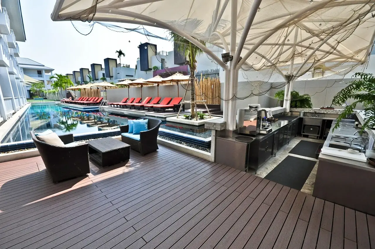 HYBRID WOOD ติดตั้งด้วยไม้พื้น หน้ากว้าง 4 นิ้ว มีความแข็งแรง ทนทานต่อแสง UV ความซีดจางจะช้ากว่าไม้จริงเป็นระยะเวลาหลายปี ทำให้ผู้เข้าพักได้รับความสดใสจากสีสันการตกแต่งของรีสอร์ทอย่างเต็มที่